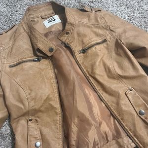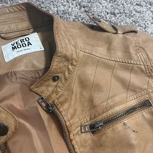 Biker style faux tan leather jacket from Vero Moda. Cute and comfy! It has a dark mark near the front pocket, otherwise in really good condition!