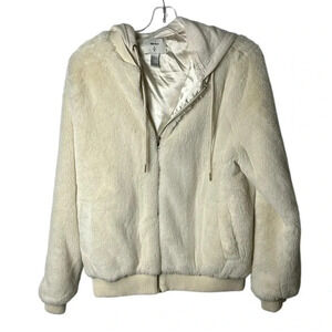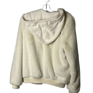 Faux fur bomber jacket hoodie, zipper, LIKE NEW, cream,detachable hood,mob wife