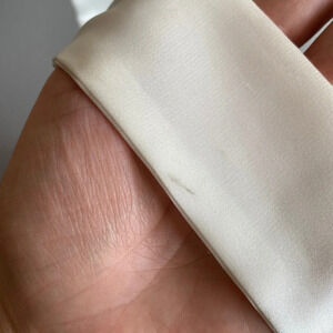 Some markings on the satin ribbon and inside - see images. It would be visible up close. Stain removal not attempted.