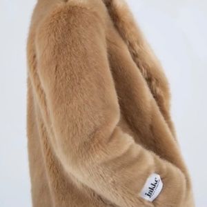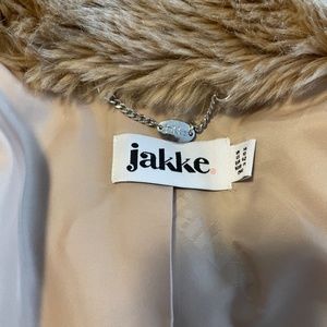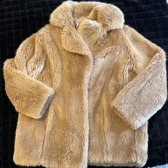 Beautiful oversized jacket by Jakke in a sand colour. Made from faux fur and has a discreet fastening at the front, as well as pockets at the sides. Super fluffy and very warm. It is size 10 but I normally wear a size 14 and it was big on me. Pit to pit measures 23”. This retailed for $362.