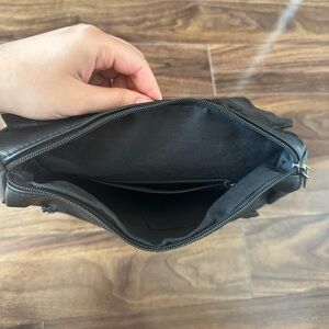 Faux leather backpack with one main compartment, one pocket in front and two on the sides. Slim size, good for college students