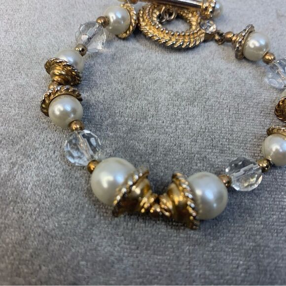 Faux pearl clear beaded gold tone bracelet