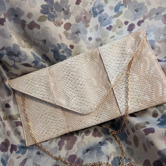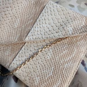 Gorgeous neutral bag with long gold chain that goes with so many things in your wardrobe. 7" x 14". Like new condition.