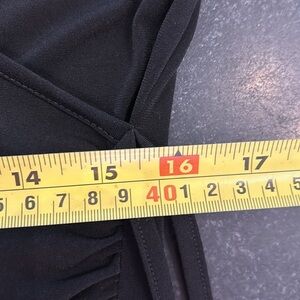 Black 90’s faux wrap dress with side tie. Measurements in pics: pit to pit, waist and length. Slim fit. Excellent condition.