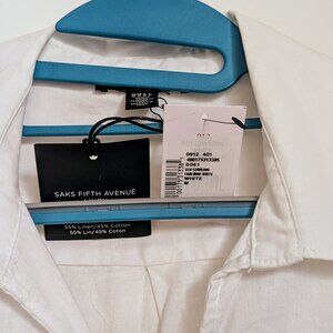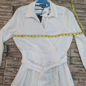 From Saks Off Fifth Avenue. White linen/cotton dress, surplice neckline with faux-wrap skirt.