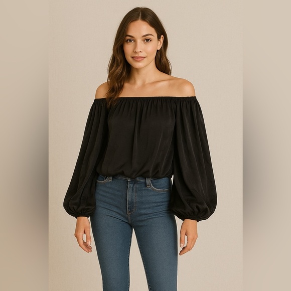 Elevate your wardrobe with this striking Favlux Fashion top in size medium. Lightly worn and in excellent condition, this black silk top features an elegant strapless design with voluminous bubble sleeves, offering a chic and unique style. Perfect for pairing with high-waisted bottoms for a night out or a stylish event.