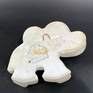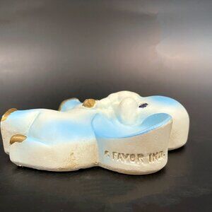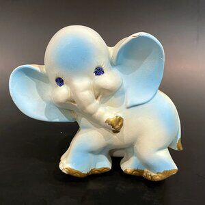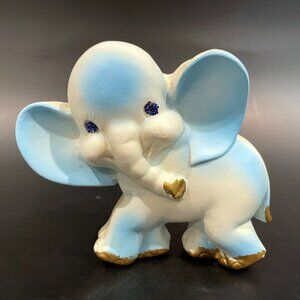 Adorable set of 3 chalkware elephants by Favor Inc. Each elephant has blue and gold accents and blue sparkles for eyes. Each has a hook on the back to hang on the wall. Perfect for a nursery, or eclectic elephant decor.