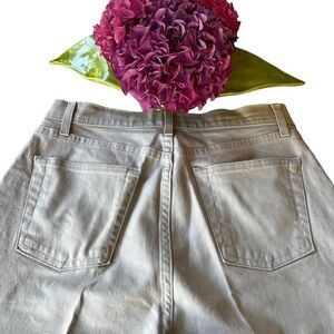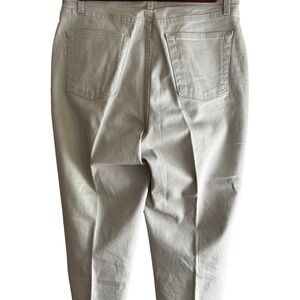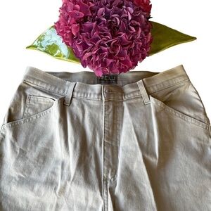 In excellent pre-owned condition, great quality cotton blend with some stretch, front zipper, pockets back and front, size 10, see measurements. Color is a light sand. Best pictures for color are #1-4. High waisted.