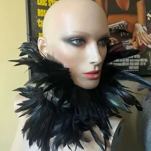 Elegant black feather collar. Center band is latex and closes with a ribbon tie.