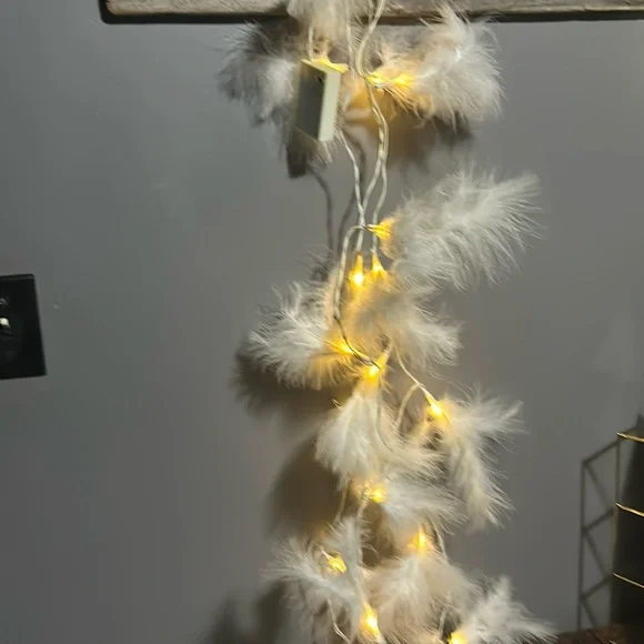 Battery operated feather warm colour lighted string. Approximately 150’. See listing for blk set. Timer setting as well.
