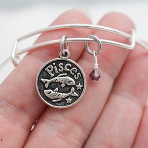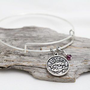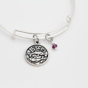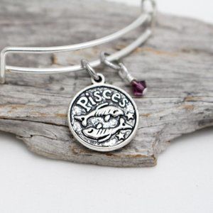 February Pisces Adjustable Charm Bangle - Handmade Zodiac Bracelet