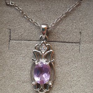 February's Birthstone Amethyst with a clear stone above the Amethyst in the pendent in sterling silver stamped (925) Necklace 18 in. Believed to possess a powerful calming metal effect, the amethyst brings serenity and peace of mind to the wearer. Has never been worn comes with original jewelry box.