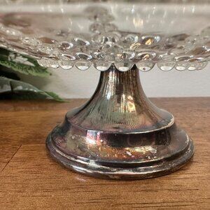This striking clear glass pedestal plate in the Columbia pattern by Federal Glass showcases the elegance of 1930s Depression glass. Featuring a square form with graceful curved corners and a radiating sunburst and dot pattern, it rests on a silver-toned metal base that adds a touch of vintage charm. Whether used for displaying sweets, candles, or collectibles, it’s a timeless piece of American glassware.