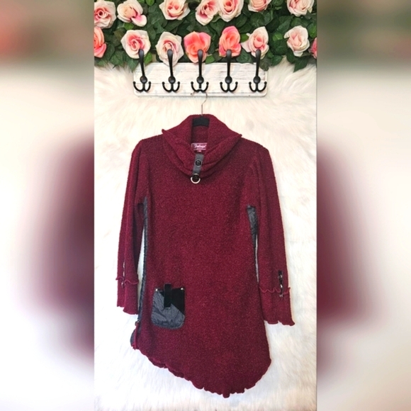 Step into effortless style with this uniquely designed cranberry mini tunic dress. Featuring an eye-catching asymmetrical cowl neck and a rich marled knit texture, this piece offers a perfect blend of comfort and sophistication. Thoughtfully placed fabric contrasts and button details add a touch of individuality, making it a standout choice for any occasion. Whether you're dressing it up or keeping it casual, this versatile tunic brings a fresh, feminine charm to your wardrobe.