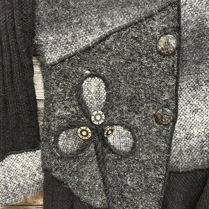 Very nice medium weight knit cardigan. Long Line. Chunky buttons. Lace collar. Applique on one side.