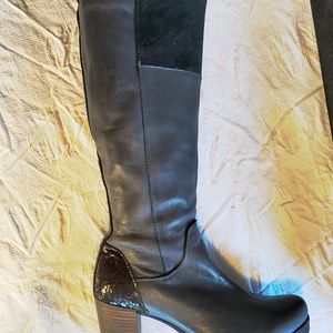 These new in box, stunning high boots are made in Portugal. Unexpected details underline the identity of the collection: a mix of leathers with different textures, shiny effects with materials that reflect them in matte tones, with an irreverent touch coming from custom soles. Incredibly comfortable thanks to internal sole platform, combined with vibrant effects of details with metallic touches, illuminate this collection. Wear with our without cloth ties for a funky touch.