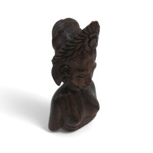 This stunning hand-carved wooden bust sculpture depicts a female figure from Bali, Indonesia.