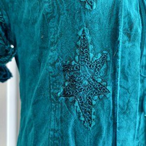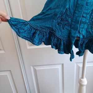 Such a pretty pretty top. Rich colour (more like a dark rich teal on the blue end of the spectrum), details such as front and back ties, flutter sleeves and hem. See photos for details and measurements.