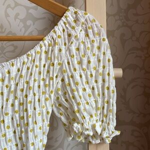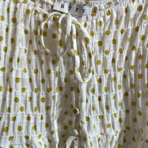 Beautiful ruched cotton short sleeve blouse. Delicate covered buttons and tie front. New without tags. Sweet polkadots design. Excellent condition.