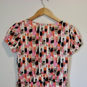 Femme Multicolour Midi Dress Short Sleeve Ruffle Hem Office Work ~ Size Small ~ 96% Polyester, 4% Spandex ~ Made in Canada
