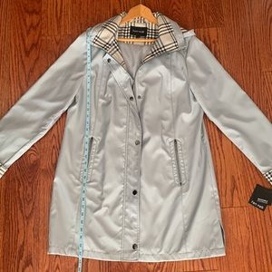 Style: Light blue/grey full-zip raincoat by Fen Nelli, perfect for in between seasons! Long sleeve, pockets, lined, zipper closure. Removable zip up hood, patch detail pocket. Designed in Canada and made in China