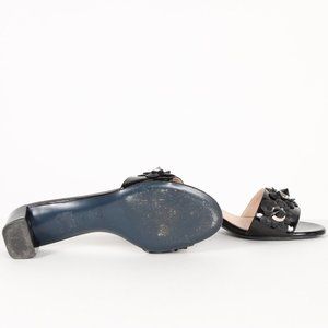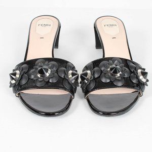 These Fendi block heel slides are a great addition to any wardrobe. They are a versatile black patent leather with the classic Fendi embellished flowers across the vamp. The heel is 2" high and they have been worn once and are in perfect condition. These come with the original box and dust bag.