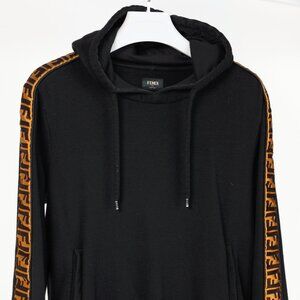 Made in Italy, this sports-luxe hoodie from Fendi circa 2018 is crafted in a Black brushed wool-blend fleece, and is adorned with tan Zucca-logo tape along the sleeves. It features long sleeves, ribbed cuffs, a drawstring hood, front slit pockets, and a banded ribbed hem.