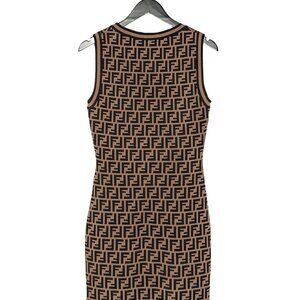 Soft stretch viscose blend fabric. Sleeveless Knit mini dress featuring the iconic allover FF Zucca monogram in brown and black. Designed with a fitted silhouette, scoop neckline, and ribbed trim at collar, armholes, and hem. Made in Italy.