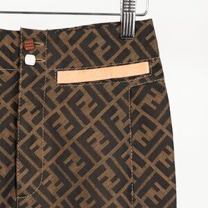 Made in Italy, this pencil skirt from Fendi is crafted with a brown cotton-blend jacquard in the designer's FF Zucca monogram, and features a front double button and zip fly closure, felt welt pockets with leather trim, a back vent, and a knee-length hem.