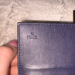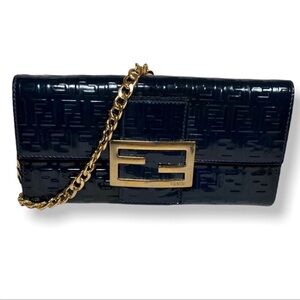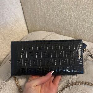 Sleek and stylish dark blue/Navy FENDI embossed wallet with a chic chain strap. Perfect for any occasion.