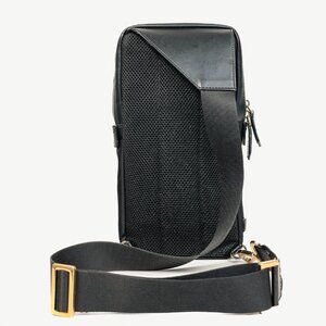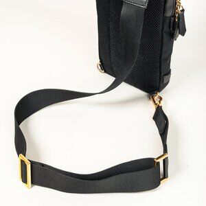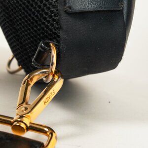 Circa 2015, this sling bag from Fendi's Monster collection is crafted in a mix of black leather and nylon, and is adorned with triangular eyes at the front. It features gold-tone hardware, an adjustable shoulder strap, a front zip pocket, and a padded mesh back. Secured with a zip closure, the main compartment opens to a tonal logo jacquard-lined interior containing a zip pocket.