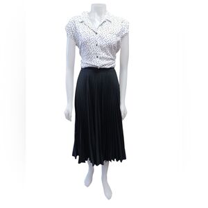 Black in color featuring a side button and zipper closure. This midi is pleated and was made in Canada. No stretch available.