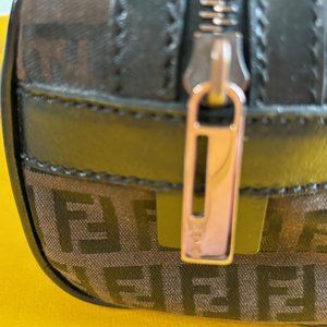 Leather handles, darkened hardware. Interior has one zip pocket and the metal Fendi plaque. Gorgeous and rare east-west silhouette, made in Italy.