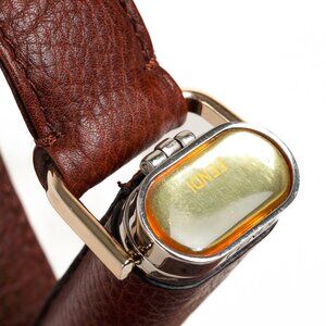 The Spy clutch from Fendi's 2005 Spring and Summer collection is crafted in a brown pebbled leather pleated throughout the body, and features both silver and gold-tone hardware, a top handle with a hidden compartment, D-rings to attach a shoulder strap, and a top clasp closure that opens to a tan and black FF-jacquard-lined interior containing a single flat pocket.