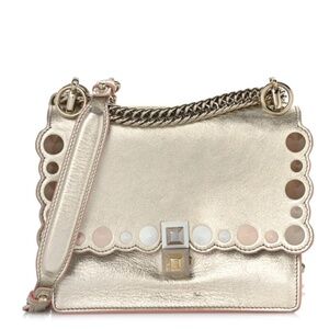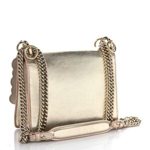 Mini-bag with flap and two-tone plexiglass double studs fastening. The interior features a pocket and two compartments divided by a stiff partition. Can be worn cross-body or carried by hand thanks to the long chain shoulder strap. Made of champagne colour laminated leather. The flap with scalloped edging is decorated with multicolour studs of different sizes to create a degrade effect. Gold finish metalware.