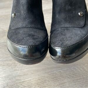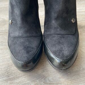Superb pair of riding boots in black suede leather, easy to put on with zipped opening on the interior side, elegant logo button detail on the exterior side, black patent box calfskin platform, black lambskin lining, leather sole by FENDI