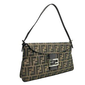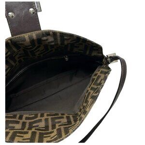 Description - Early 2000's brown canvas Fendi Zucca print double flap baguette bag with silver tone hardware, tonal leather trim/embellishment, single tonal adjustable flat leather shoulder strap, brown jacquard nylon lining, single interior zip up pocket, and flap closure at front with FF logo plaque embellishment.