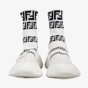Circa 2019, these slip-on high-top sneakers from Fendi are crafted with a white stretch knit in a black FF jacquard logo pattern throughout, and feature closed rounded toes, bonded trim, and a textured white rubber outsole with a logo embossed at the heel.