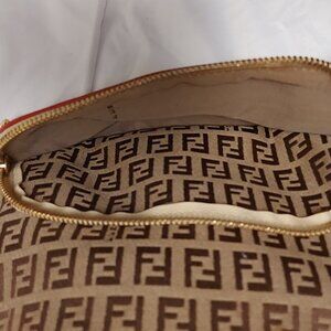 This is a Front pocket bag in brown and red canvass with red leather trim.