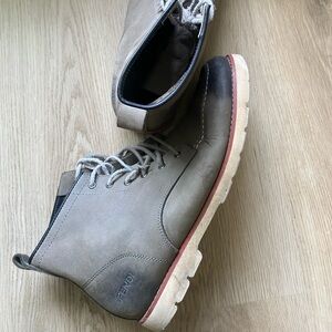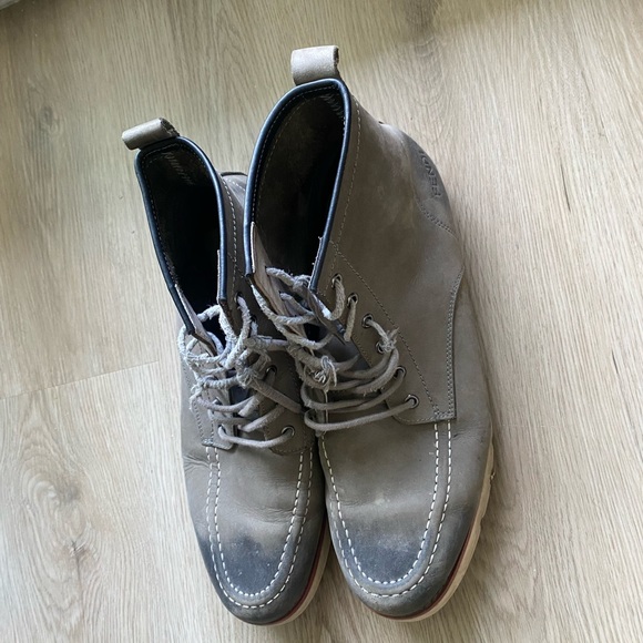 These are grey leather boots with a lace-up closure. You can change the laces. They have a rubber sole. The boots are in good condition.