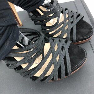Fendi strappy canvas + suede ankle wrap high heels black w/ brown wood base 38.5