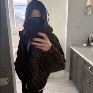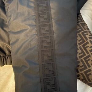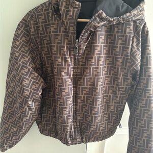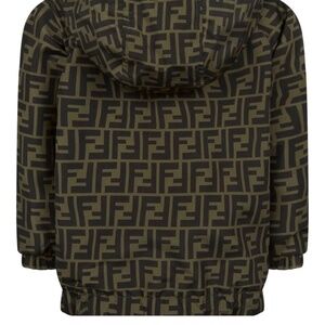 Elegant kids Fendi x kway jacket with iconic monogram pattern. Black and brown, almost olive green) and black hues. Ideal for a chic, designer look. Size 12-14 kids but fits XS adult. I’m 5’3” and it fits perfectly, see photos Introducing the Kids Reversible FF K-Way Jacket in Black, a Fendi exclusive straight from Italy! Ideally suited for boys or girls.