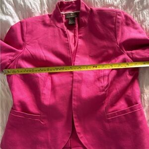Bright pink blazer with open front.l and cropped sleeves. Tailored fit. Ideal for adding color to your outfit.
