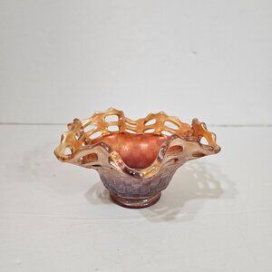 Fenton Carnival Glass Pink Marigold Reticulated Candy Bowl (Basket Weave)