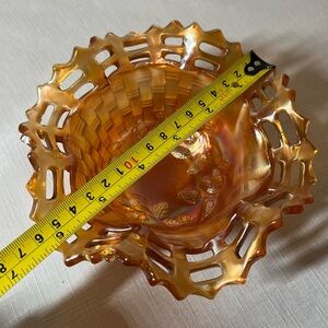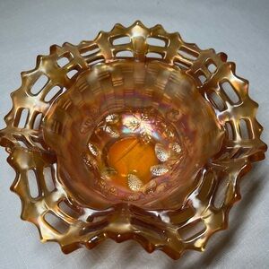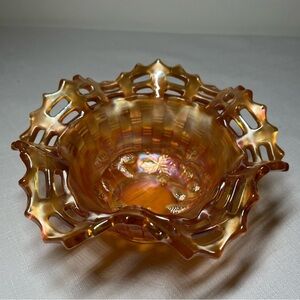 Fenton Carnival Glass bowl, basket weave open lace ruffled edge. Vintage