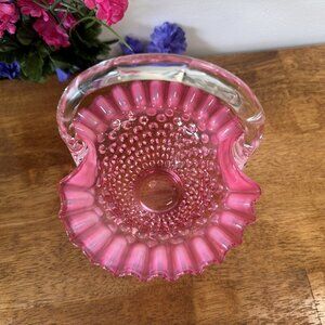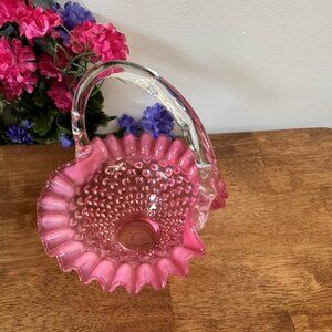 Fenton Cranberry Opalescent Hobnail Glass Basket Vintage Ruffled Edge Clear Hand