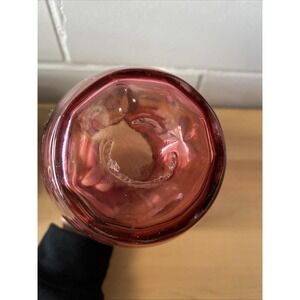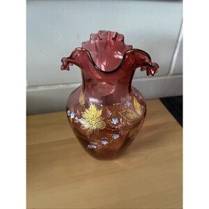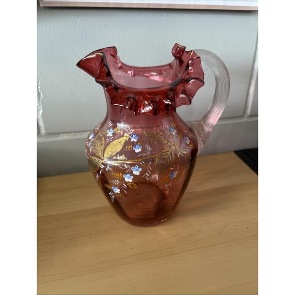 Crafted with meticulous attention to detail, this Fenton cranberry glass pitcher is a testament to classic artistry in North American glassware. The rich cranberry hue sets the tone for a vintage piece that's both elegant and timeless, complementing any home decor with its vibrant color and ruffled edge.