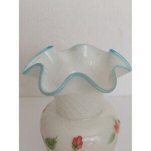 Fenton Designed Teleflora White Opalescent Vase Blue Crest Ruffled Hand Painted