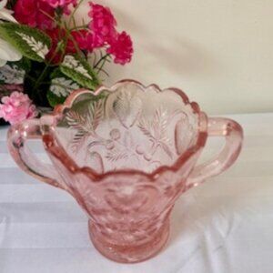 This beautiful Fenton pink art glass vase is a striking example of vintage craftsmanship. Featuring a scalloped rim, two elegantly curved handles, and a raised strawberry and leaf pattern, this vase is both decorative and functional. The soft pink tone and classic Fenton styling make it a standout piece for collectors or vintage glass lovers.