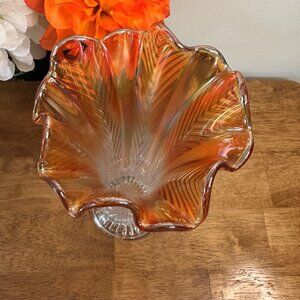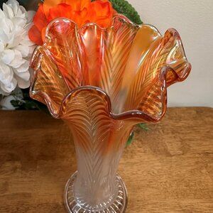 This striking Fenton swung vase blends the bold beauty of marigold carnival glass with the elegance of a clear base. Featuring elongated vertical ribbing and a fluid ruffled rim, it perfectly captures the mid-century love of colour, form, and dramatic silhouette. A wonderful display piece for any carnival glass collector or vintage décor lover.